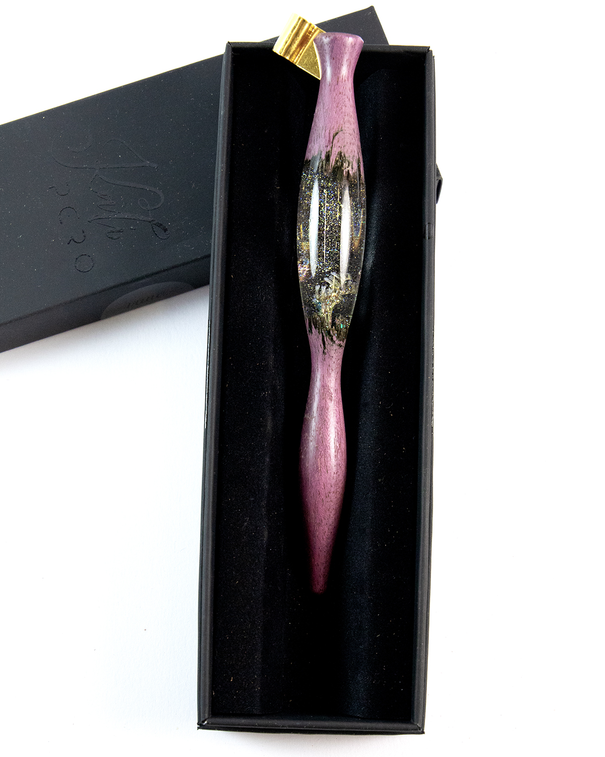 Vdechněte svým slovům jedinečnost. Toto ručně vyráběné kaligrafické pero z dílny Kalipero, spojuje vzácné dřevo amarant (Purpleheart) se svou typickou hluboce fialovou barvou a křišťálově čistou pryskyřicí, ve které je zachovaná drobounká luční květina – půvabná připomínka přírody v její nejjemnější podobě.