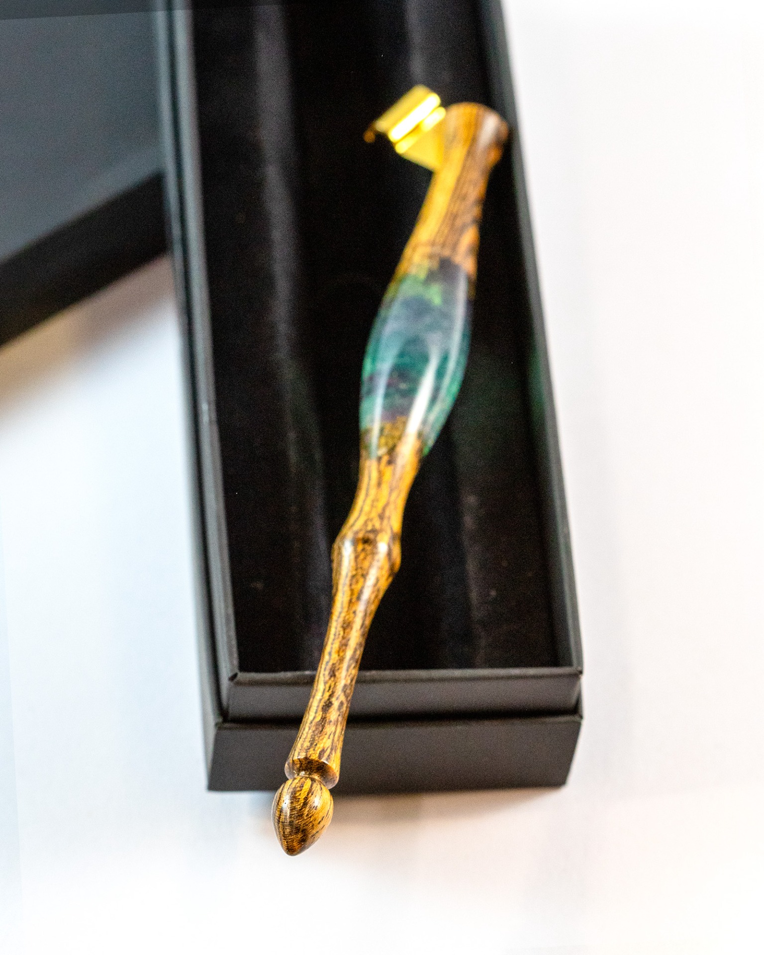 Pero je ručně tvarované, pečlivě broušené a leštěné do hladkého, příjemného povrchu. Ergonomický, lehce organický tvar skvěle padne do ruky a umožňuje pohodlné psaní i delší kaligrafickou práci. Každý kus je naprostý originál – kresba dřeva i umístění květu se nikdy neopakují, pero je zakončeno vysoustruženou ozdobnou kapkou.