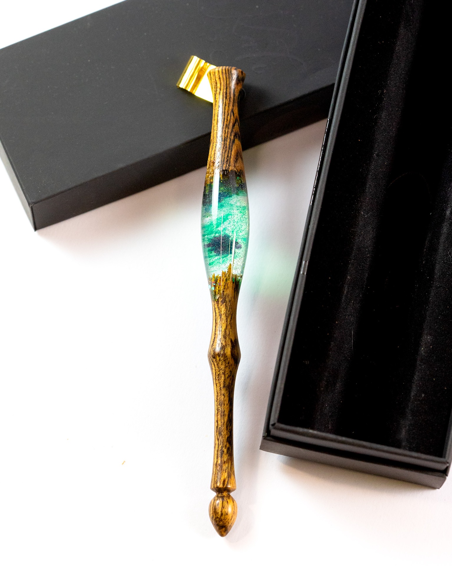 Toto originální kaligrafické pero je jedinečný autorský kus, který spojuje vzácné exotické dřevo Snakewood (Amourette) s čirou dekorativně obarvenou pryskyřicí. Charakteristická kresba dřeva připomínající hadí kůži dodává peru luxusní a výrazný vzhled, zatímco v pryskyřici je zalitý drobný barevný květ Šateru latnatého.
