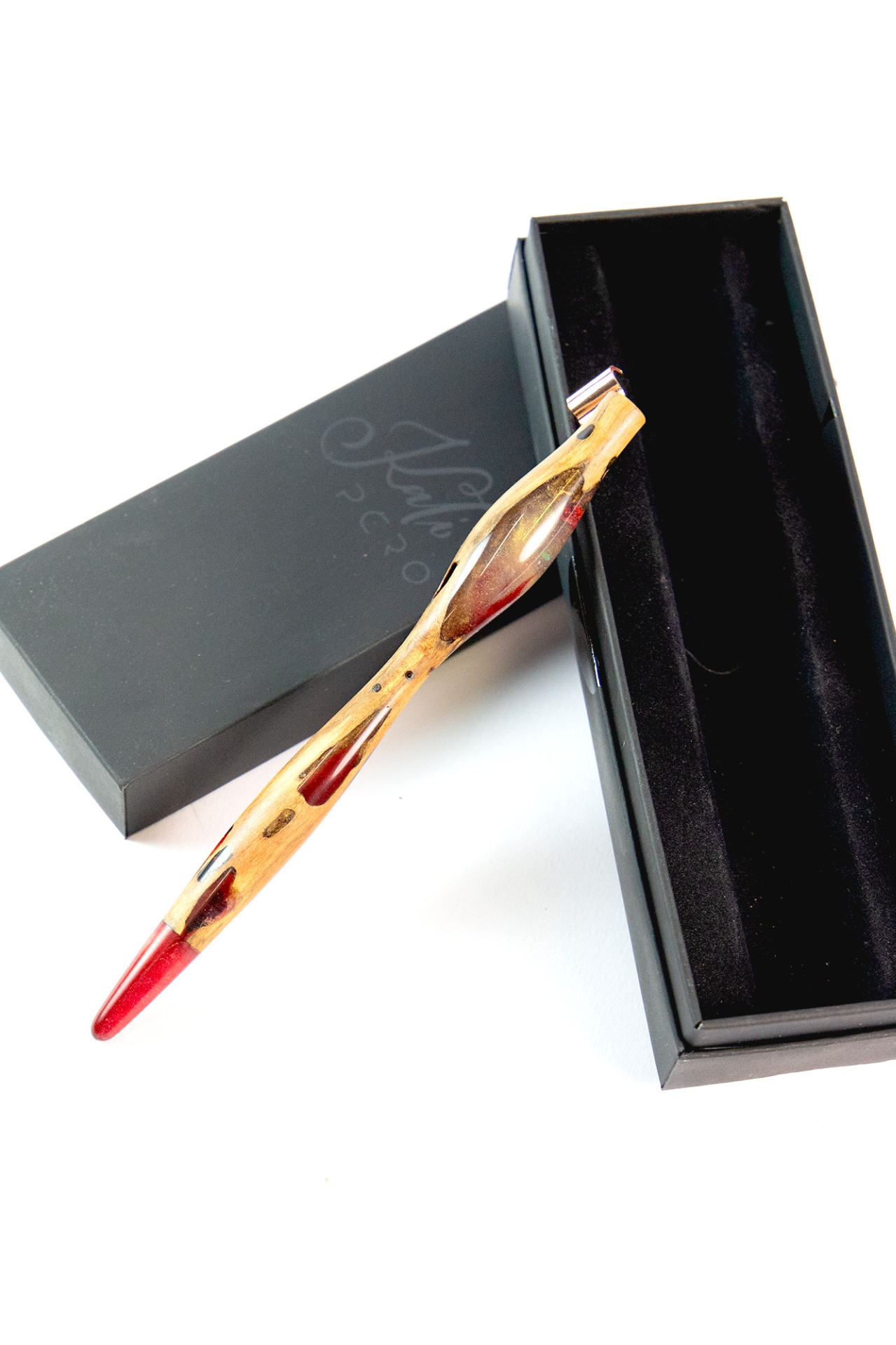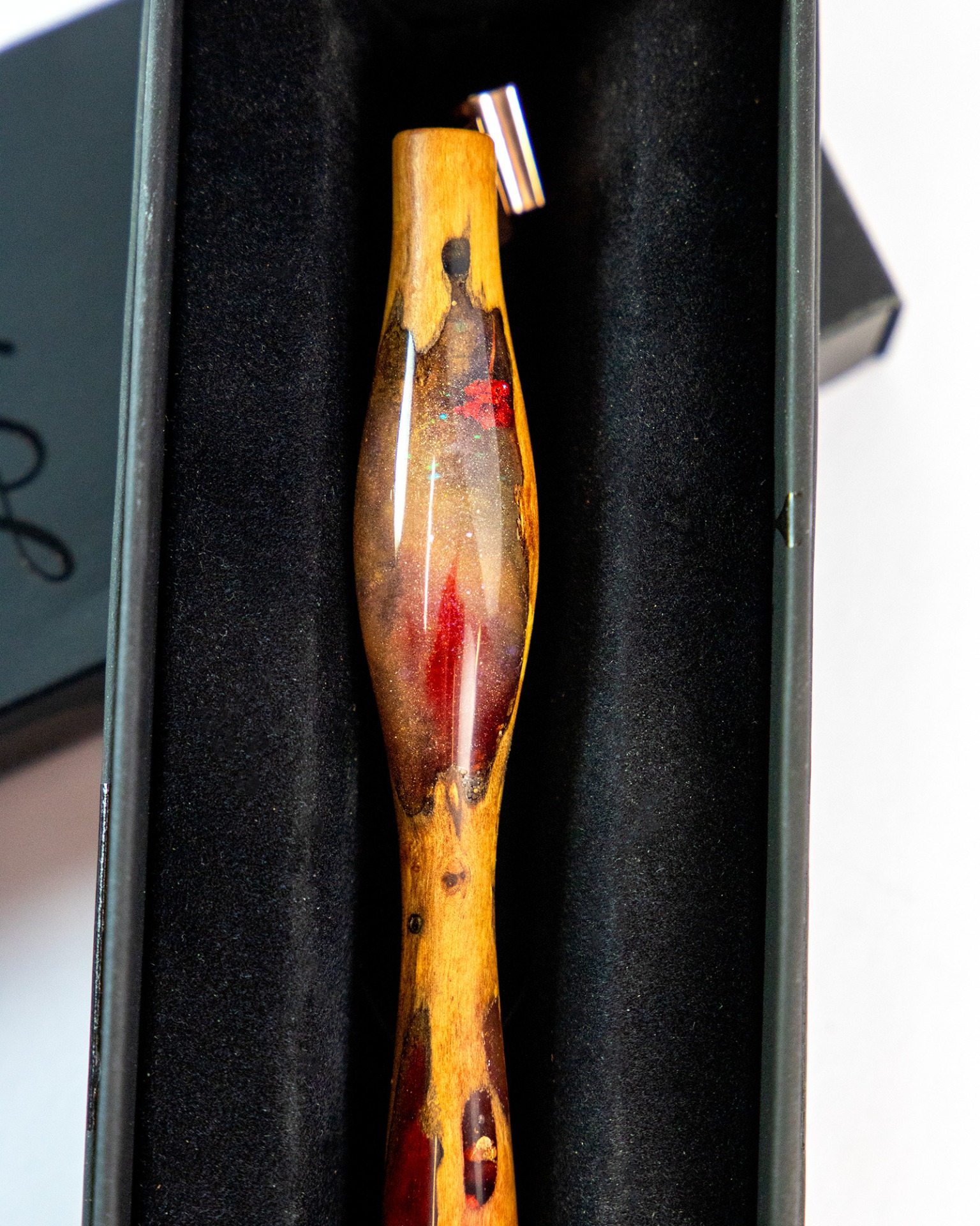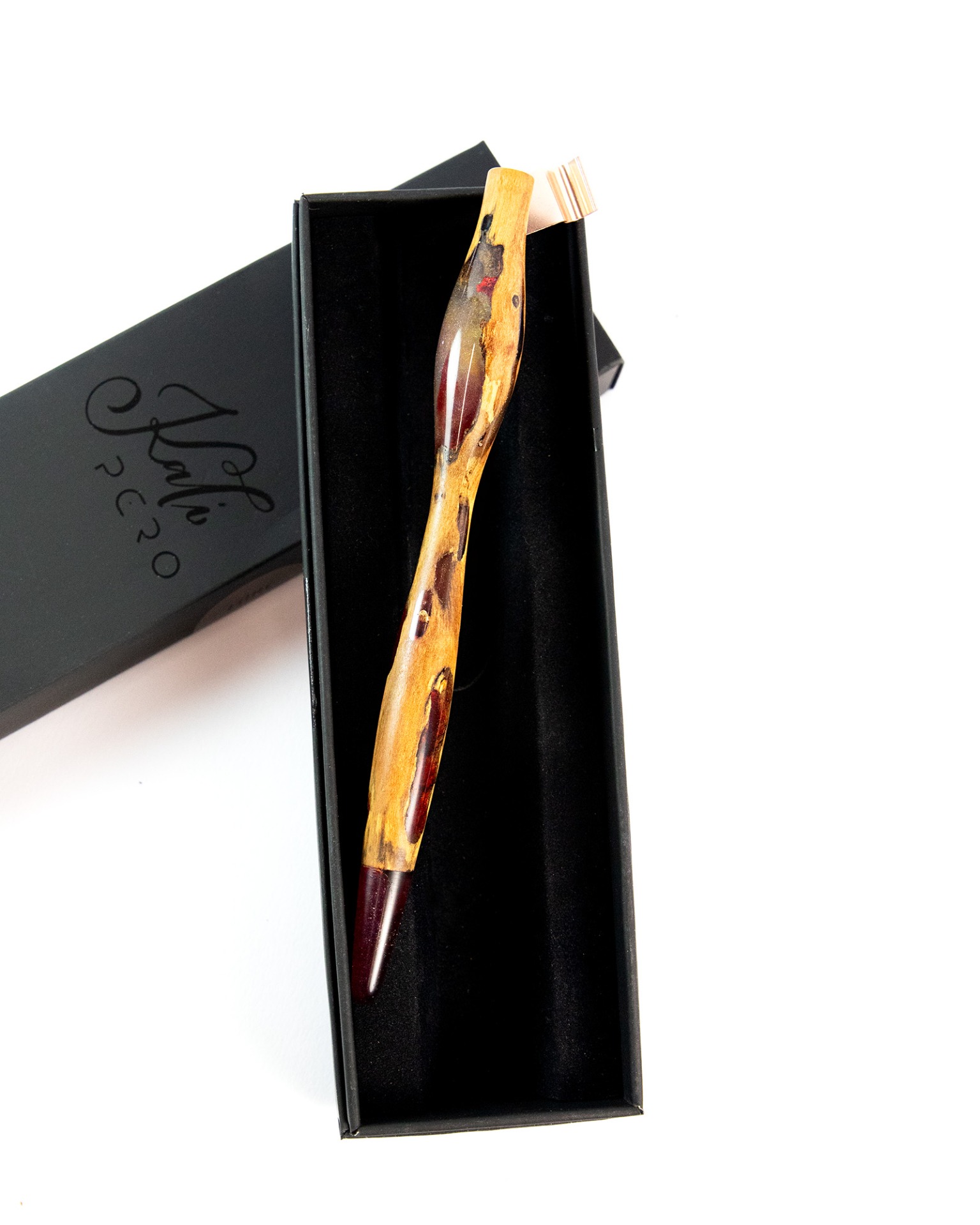 Kalipero zhotovené z prastarého olivového dřeva, které na sobě nese známky značného stáří a krásné pestré struktury dřeva. Ve vrchní části dřeva, je v pryskyřici zalitá malá, červená květina s přidanými ozdobnými prvky. Zakončeno precizní kolorovanou špičkou z pryskyřice.