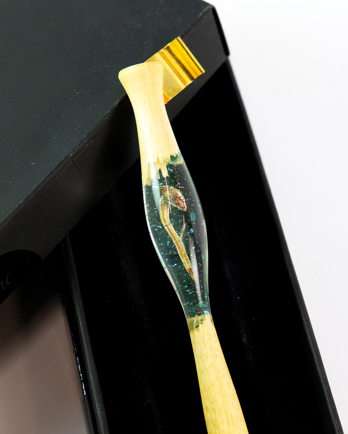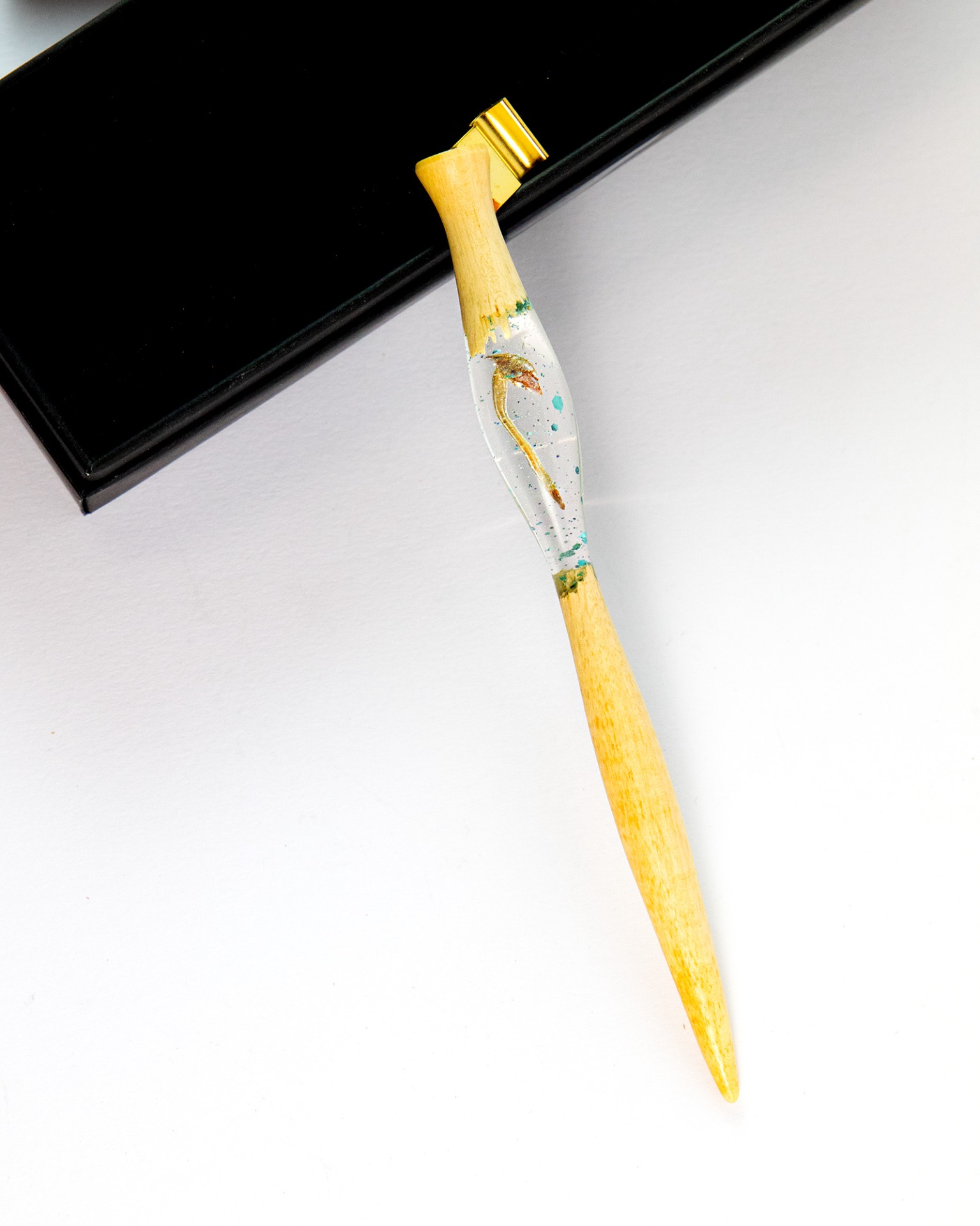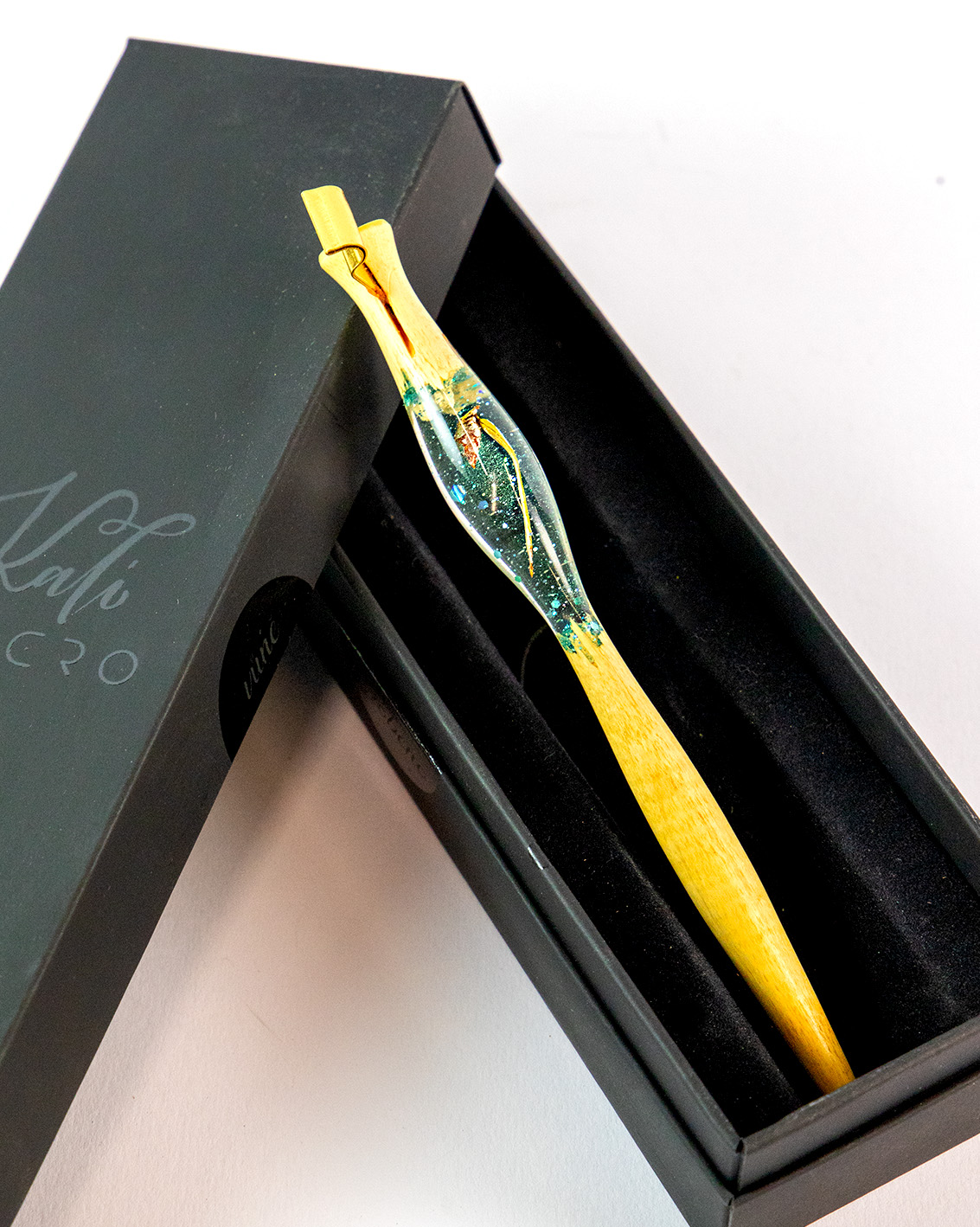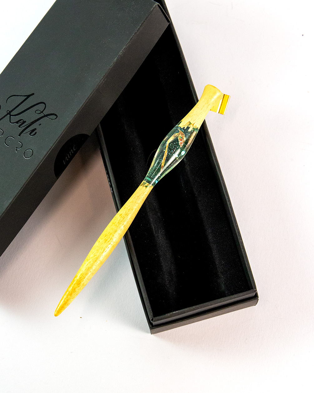 Ručně vyrobené originální Kalipero z citronového dřeva v kombinaci s čirou pryskyřicí, ve které je zalitá malá borovicová šištička s jehličkou doplněná o tyrkysové lesklé třpytky a detaily.