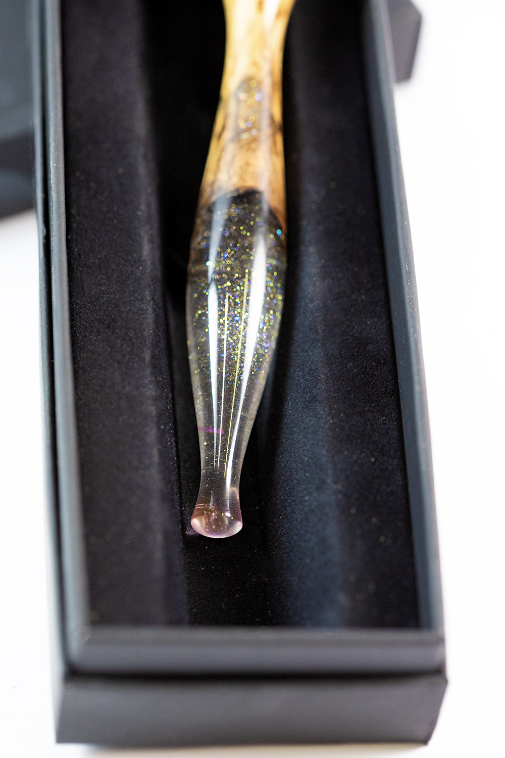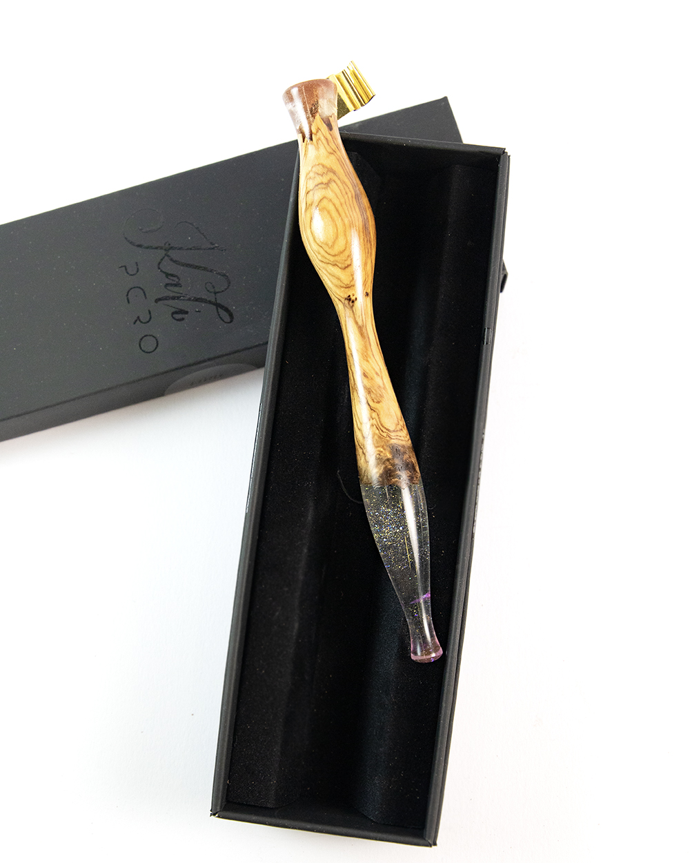 Toto jedinečné kaligrafické pero je precizně soustružené z pečlivě vybraného, starého olivového dřeva, které vyniká nádhernou kresbou a teplými přírodními odstíny. Na vrcholu i na zakončení pera je vsazena čirá pryskyřice, obohacená o drobné zlaté třpytivé kousky, které dodávají celému kusu luxusní a originální vzhled.