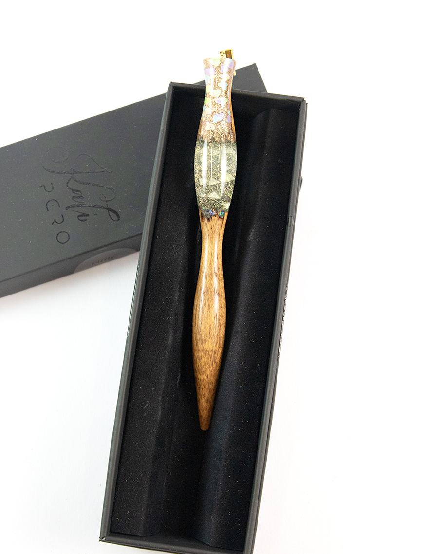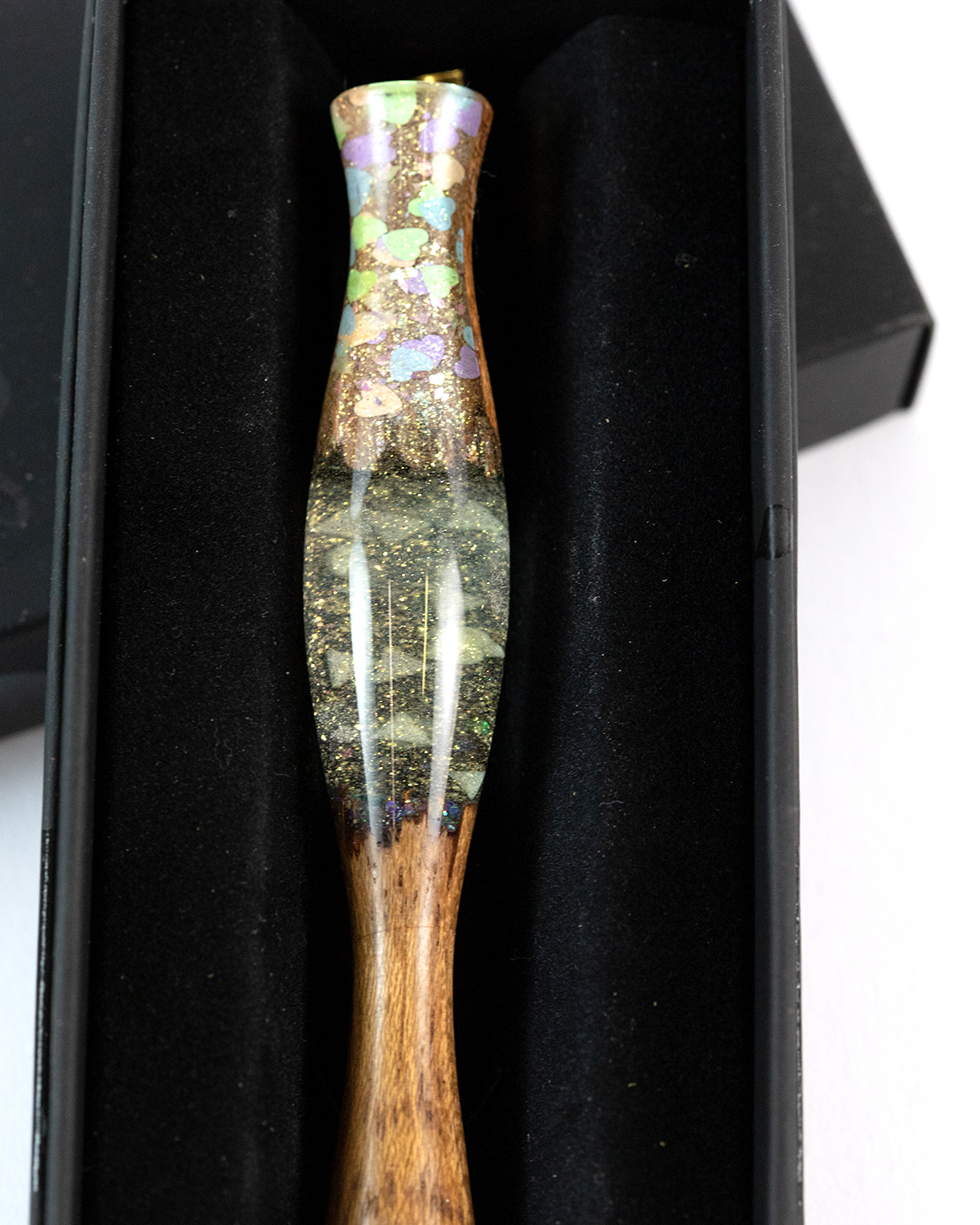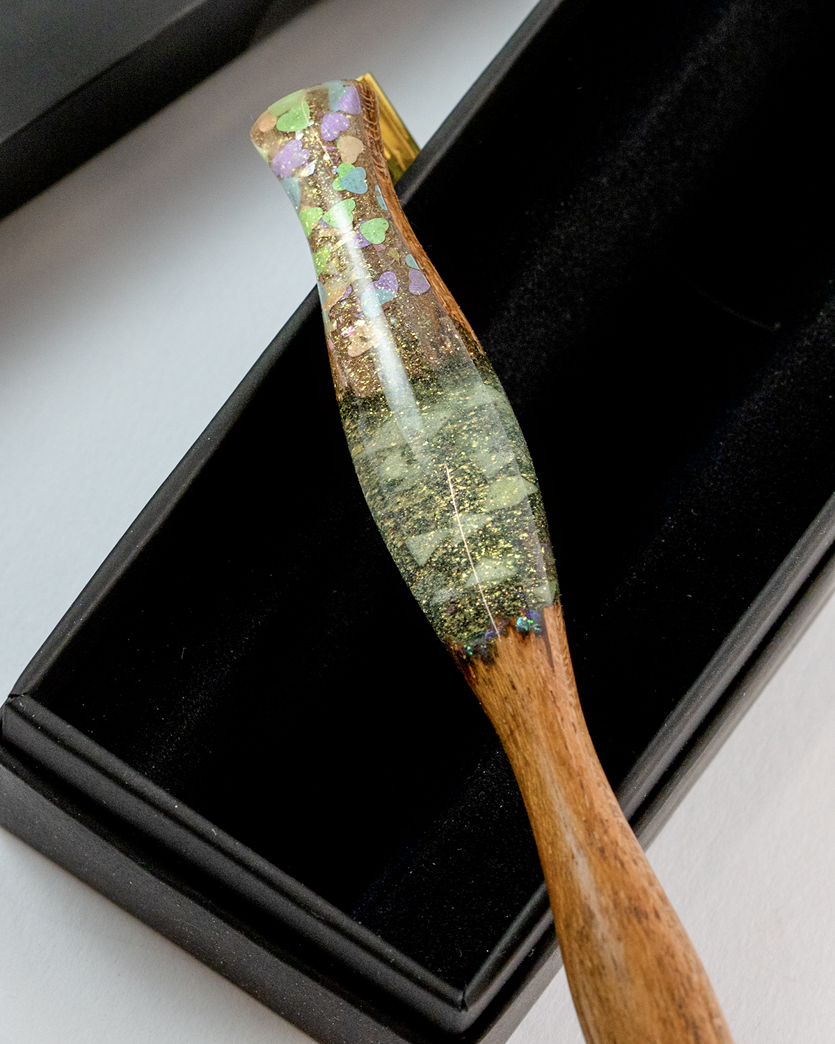 Pero je vyrobeno z vysoce kvalitního a tvrdého dřeva Padouk, které má výraznou barvu a přirozenou krásu, je ideální pro vytváření trvanlivých a luxusních psacích nástrojů. Každé pero je pečlivě soustruženo ručně, což zaručuje jedinečnost každého kusu. Na vrcholu pera je použita pryskyřice, která ukrývá barevná srdíčka opatřená fotoluminiscenční, svítivou barvou. Malé barevné detaily v pryskyřici, spolu s jemným zlatavým prachem, dodávají peru exkluzivní vzhled.
